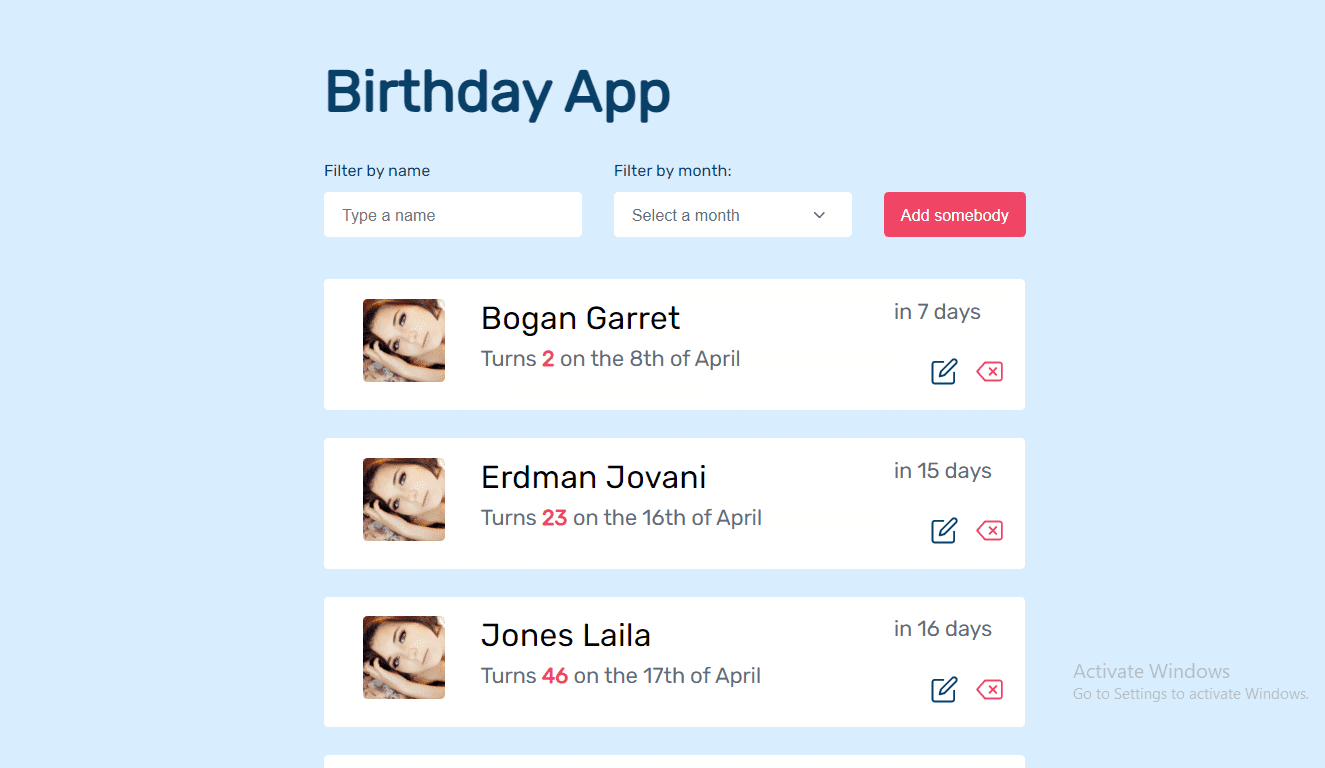 I built this project from scratch using ES6 and ES2020. It renders a list of people with their birthdays and their profile photos just right next to their names. In this application, users are able to search particular people both by their names and their birthday months. They can also add new people to the list, delete people from the list and edit both people's names and birthdays. In terms of technology, I used HTML5, CSS and vanilla Javascript to build the entire application.